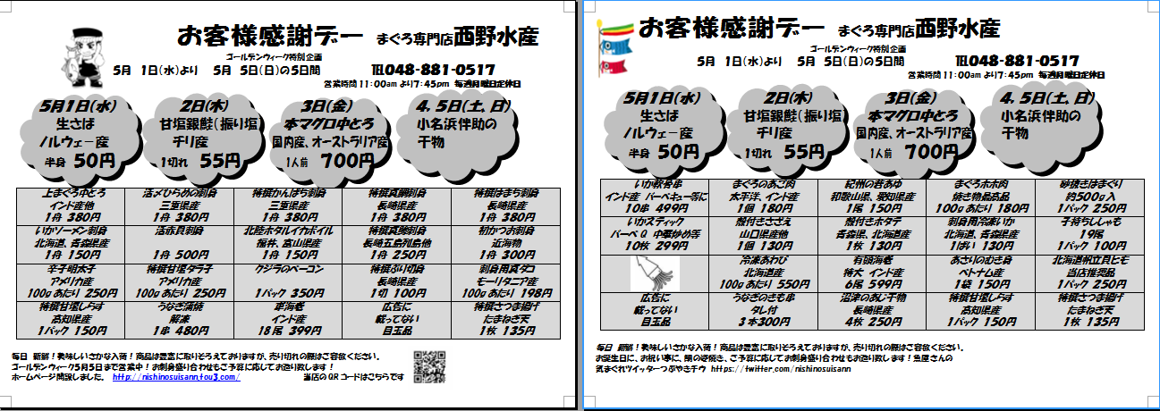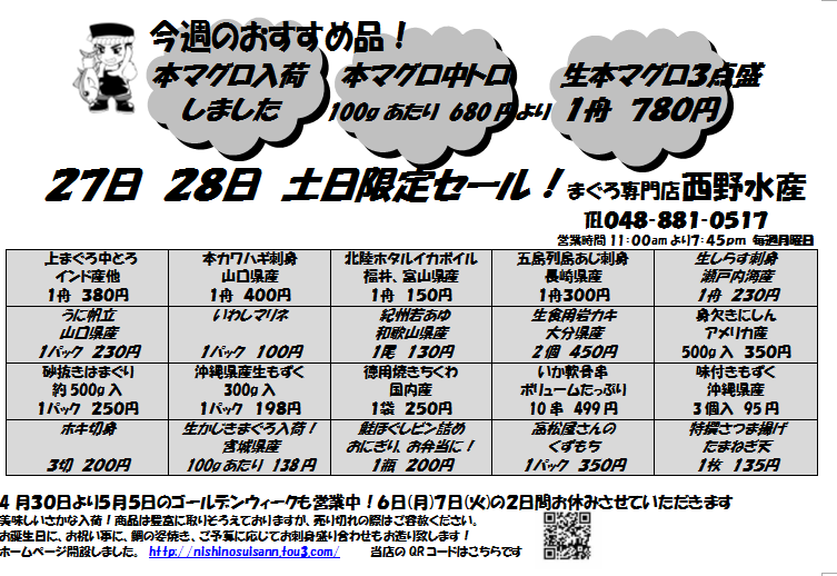 西野水産です!街の魚屋さんです。刺身と鮮魚はココでどうぞ!