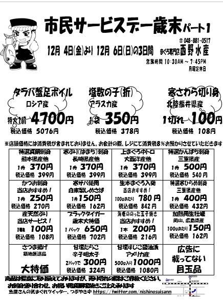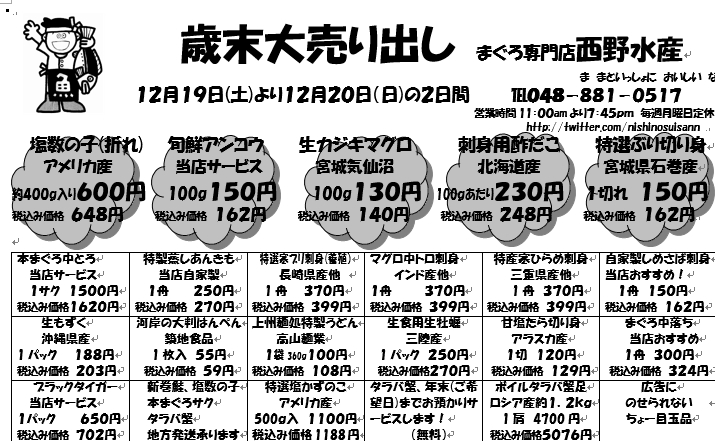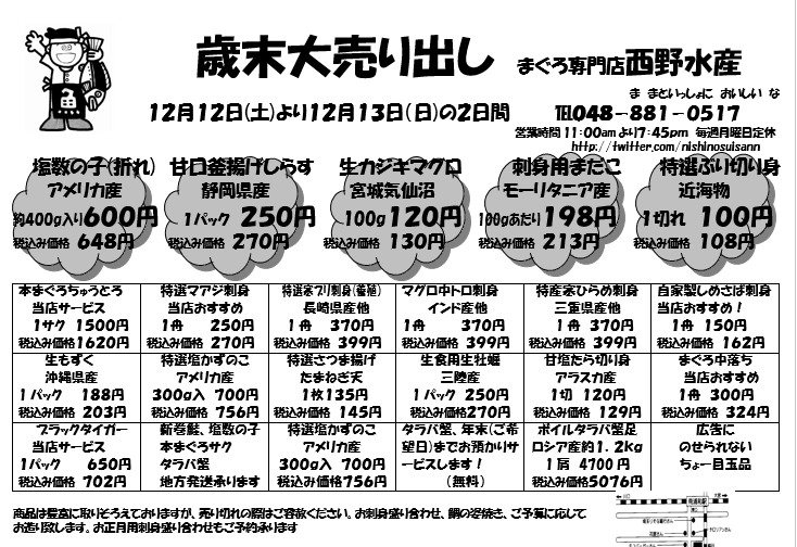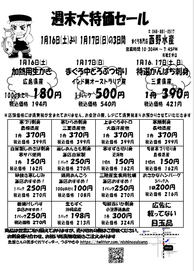 年明け店内チラシ!1月15日日替サービスのインドまぐろが入荷の関係で17日日曜日に変更となりました。