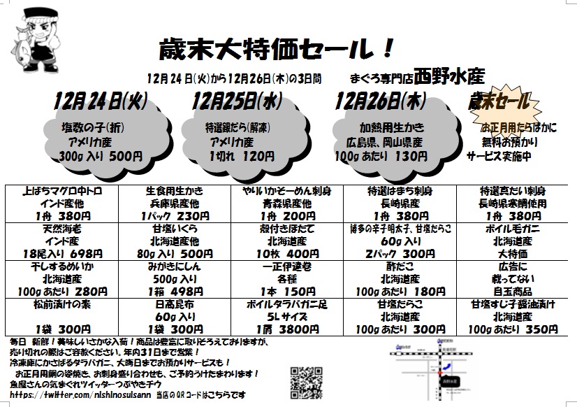 西野水産です!街の魚屋さんです。刺身と鮮魚はココでどうぞ!